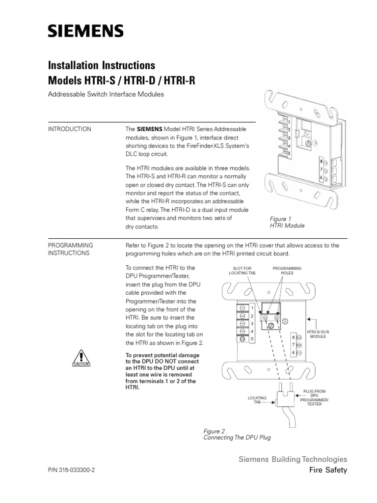 HTRI-S HTRI-D HTRI-R Addressable Switch Interface Modules Installation Instructions - Installation Instructions - HTRI-D - HTRI-R - HTRI-S A6V10239161_enpdf Assortment_custom FireFinder XLS Product_Group_Custom Fire - Detectors Peripherals. WIRING Ref er to Figur es 4 -9 R efer to the appropriate wiring diagram belo w and wire the. Model TRI-D as well as Siemens TRI-S and Siemens TRI-R which are both designed to monitor a NO or NC dry contact.